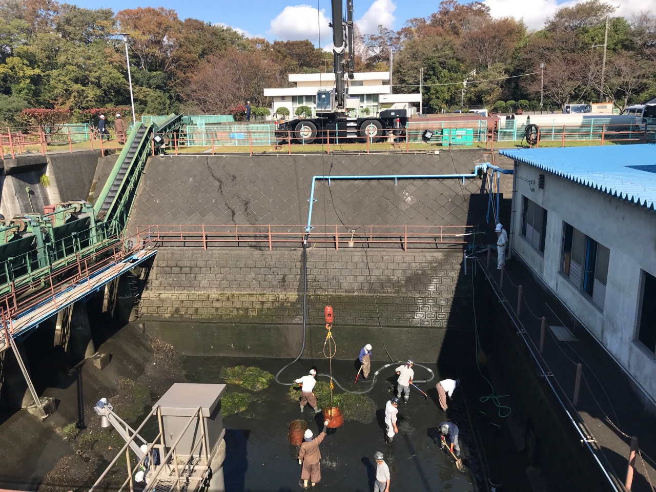 一年に一度だけ断水をして、導水路という池に溜まった水草や砂を作業員 約20名で清掃しています。